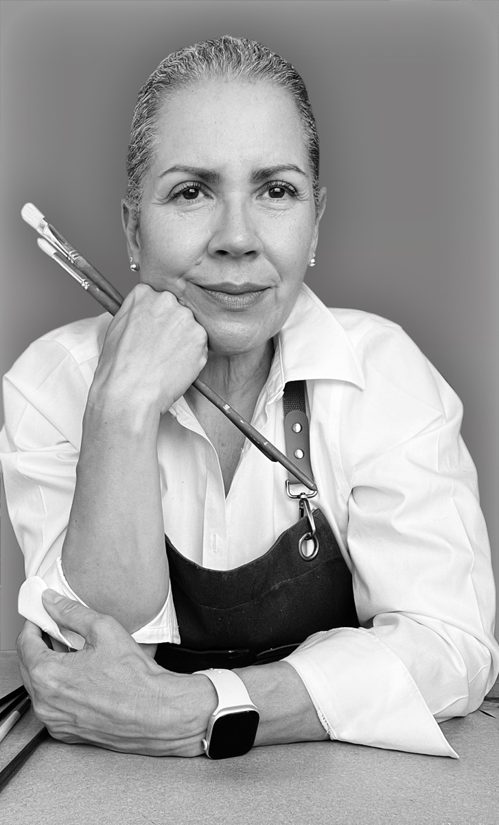 From a young age, creativity was woven into the fabric of Theresa’s life. Crayons, pencils and watercolors were what she used instinctively for her visual expression. Art was her solace and a passion she shared with Haydee Hernandez, her mother. Theresa’s artistic instincts have always been and remain the driver of her creativity. Outgoing and quirky around those she connects with, she is happiest when spending her time in her studio. Her process requires her complete attention—nothing else exists during these intensive creative sessions. She has fully committed herself to her craft, spending countless late nights in her studio, chasing artistic fulfillment.